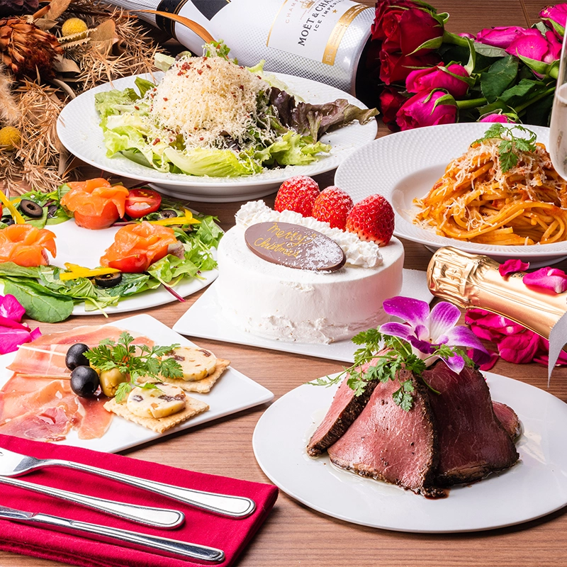 「熟成ローストビーフ」や「蟹のトマトクリームパスタ」など、クリスマスを華やかに彩るお料理と、スパークリングワインを含む250種以上の飲み放題が付いた贅沢な内容となっております。